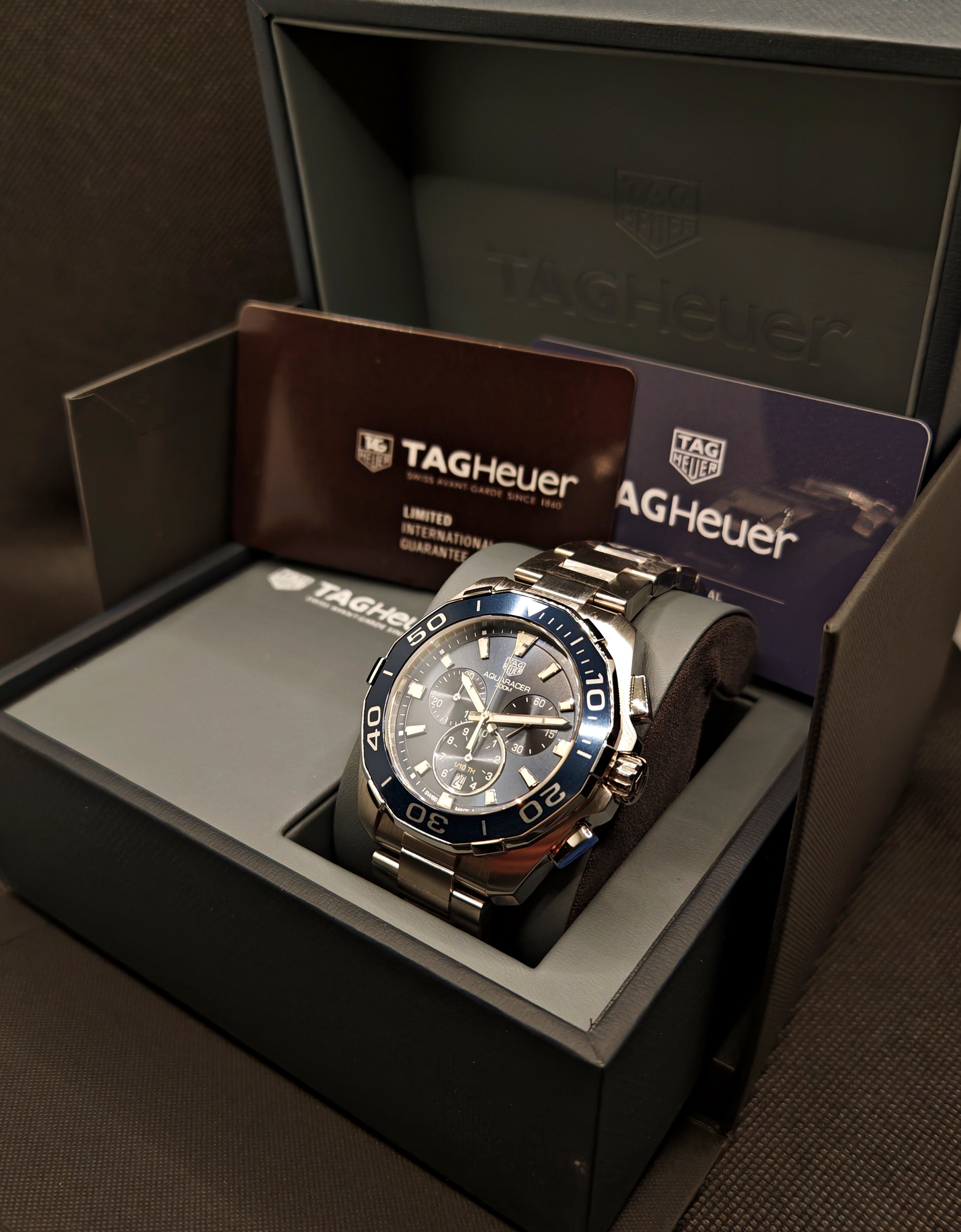 Questo modello si distingue per perpetuare la tradizione di TAG Heuer negli sport acquatici ad alta pressione, iniziata nel 1895 con il primo brevetto per cassa impermeabile della Maison. Il robusto e versatile Aquaracer combina funzionalità professionali da immersione con un'estetica sportivo-elegante che lo rende perfetto sia per le attività subacquee che per l'uso quotidiano. Il quadrante blu con effetto soleil cattura la luce in modo affascinante, mentre il cronografo con precisione al decimo di secondo offre prestazioni cronometriche eccezionali. Un orologio che unisce heritage svizzero e tecnologia moderna.